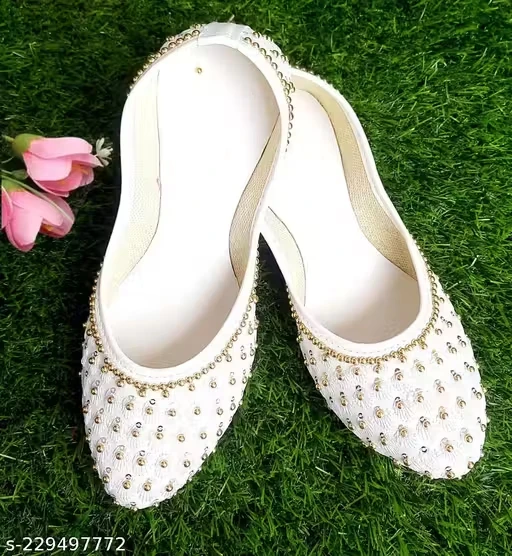 A masterpiece of traditional craftsmanship! These beautiful flat Mojaris feature a full coverage of tiny white beadwork and sequins, accented with a charming trim of dangling gold metallic beads around the opening. The soft, flat sole ensures comfort, while the luxurious embellishment makes them a standout accessory. Perfect for adding a touch of sparkle and heritage to any outfit.Simple yet sophisticated, these ethnic flat slip-ons are a wardrobe essential. The crisp white fabric is beautifully decorated with a combination of pearl-like beads and shimmering sequins for a subtle yet captivating effect. These Juttis offer a stylish, comfortable alternative to heels and are versatile enough to wear with both Indian and contemporary fusion looks.